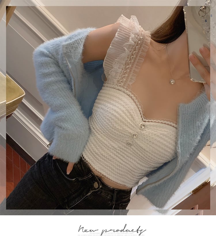 色:青いセーターカーディガン,白いレースのベスト