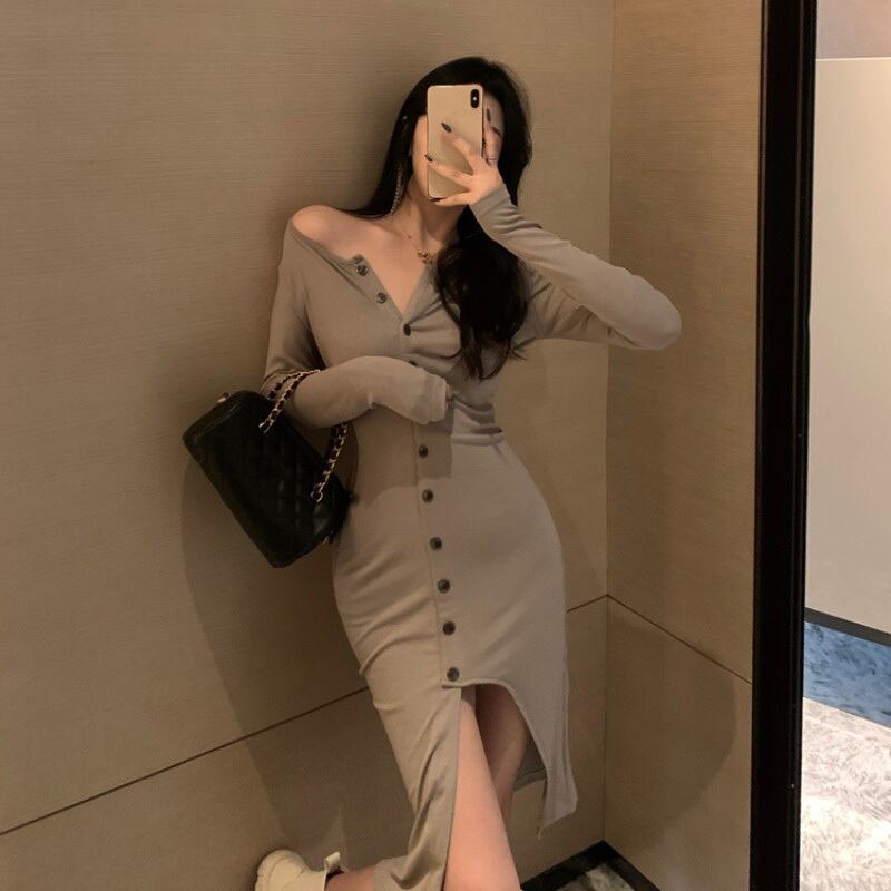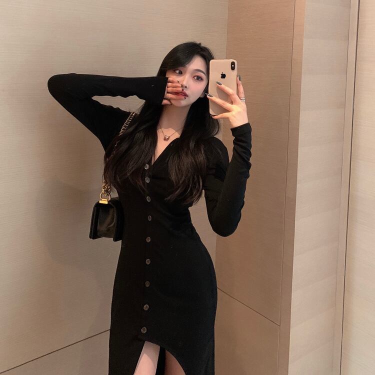 ドレス ブラックスリム長袖スリーブスカート ロング オータム 秋物 ウィンター 冬物 ブラックストロベリース59886434007