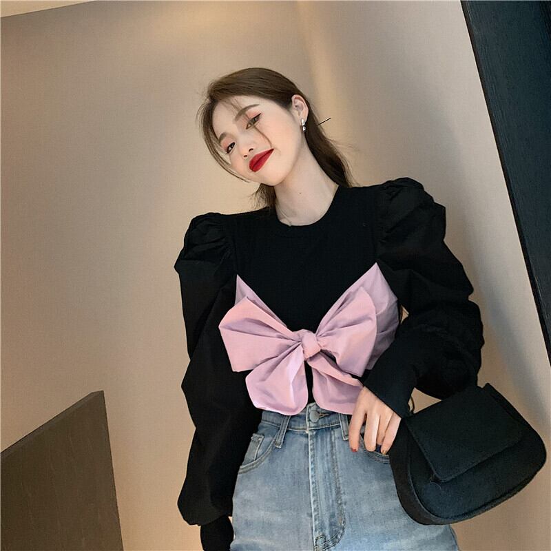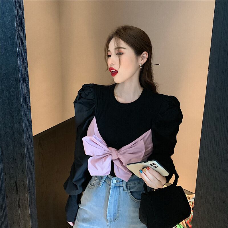 Tシャツ シャツ スリムブラックスリーブオータムウィンターリボントップス ロング 秋物 冬物 ブラックストロベリース17971333520