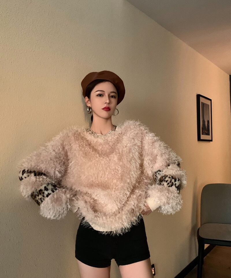ウールセーター レディースルーズレオパードトップス オータムウィンター 秋物 冬物 ステッチ ブラックストロベリース60299761788
