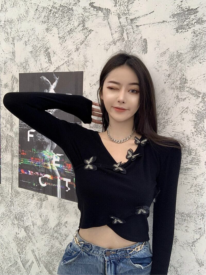Butterflyデザイン ニットシャツ Tシャツ レディーススタイルスタンダードVネックショートトップス ロング レトロ オータム 秋物 ウィンター 冬物 ブラックストロベリース84559930965