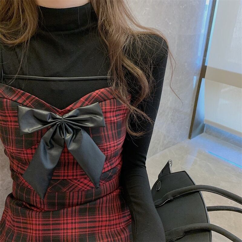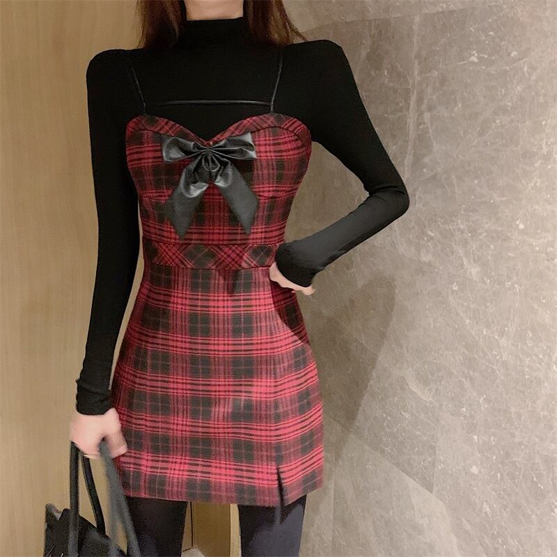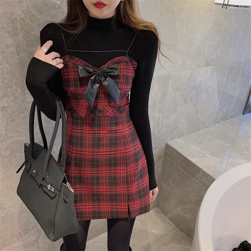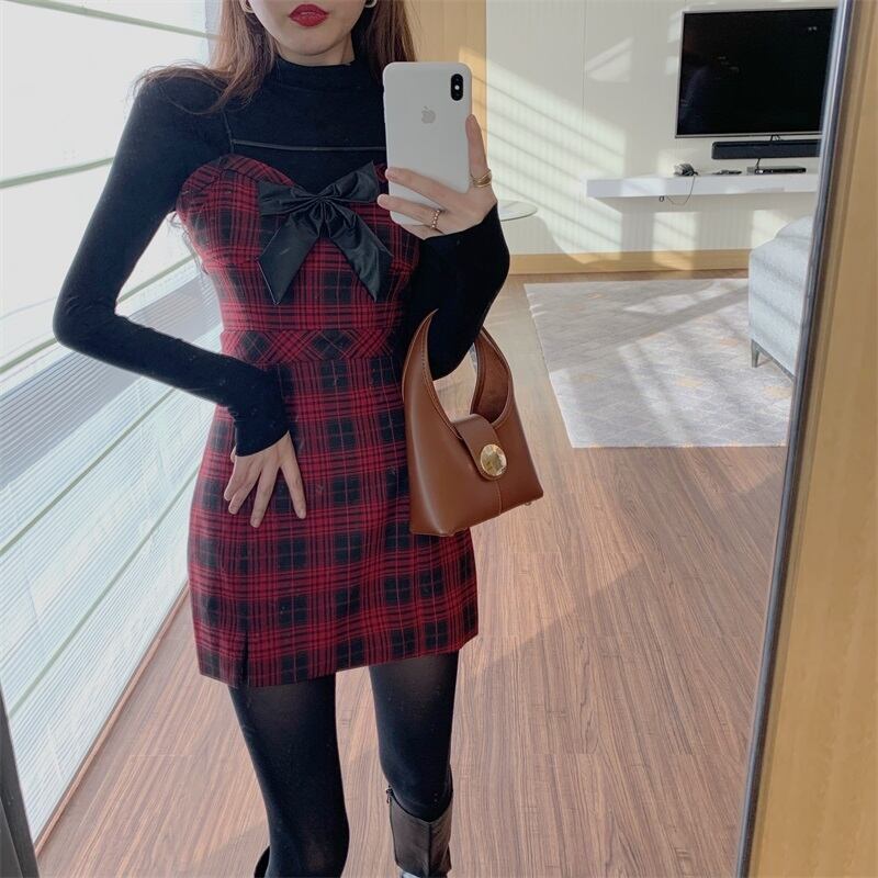格子柄ドレス オータムウィンタースタンダードショートスカート ウェストスリム レトロ 秋物 冬物 ブラックストロベリース18881515128
