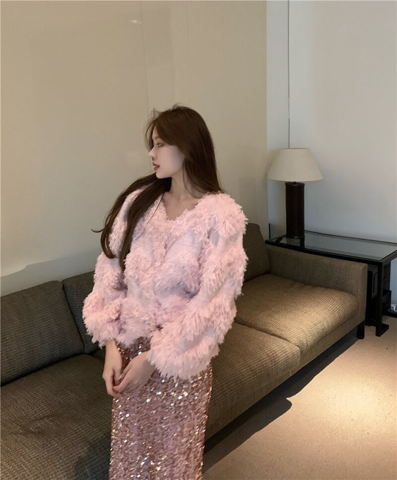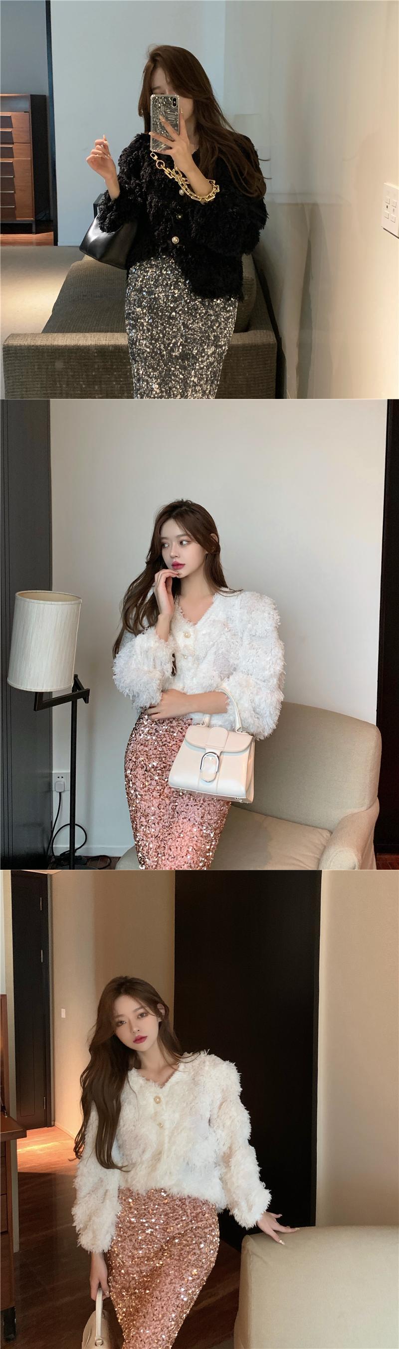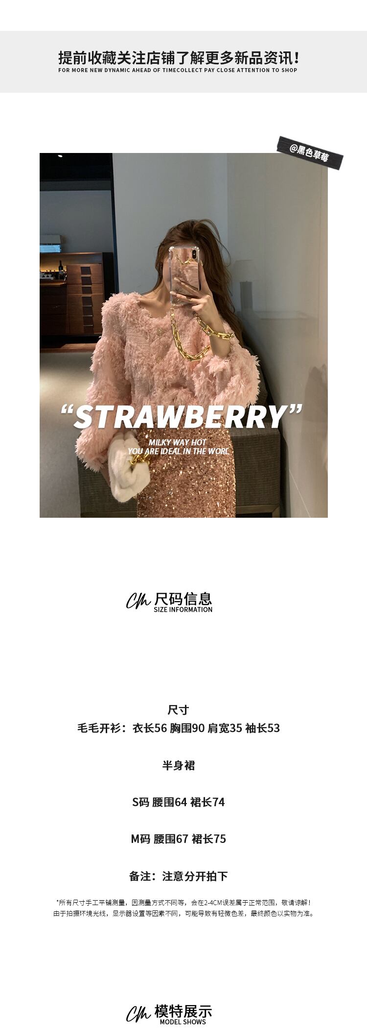 色:黒いセーター,白いセーター,ピンクのセーター,シルバーのハイウエストスカート,ピンクのハイウエストスカート