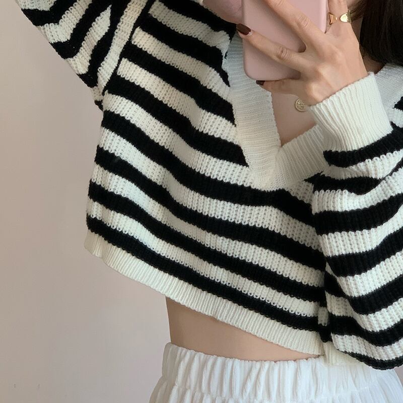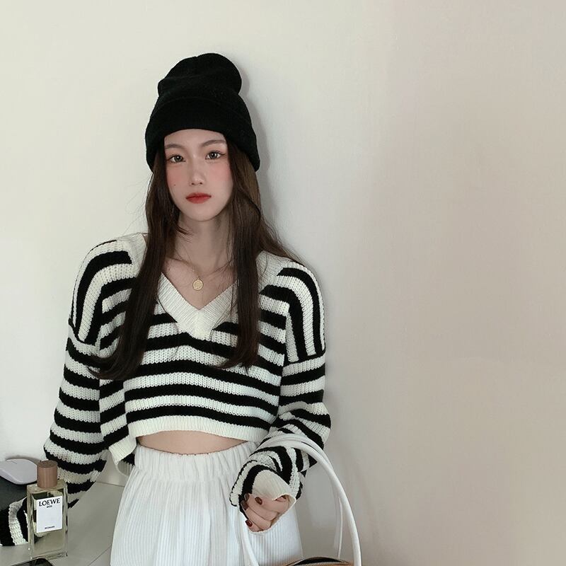 セーター ストライプショートVネックルーズニットオータムウィンタースタイルシャツ トップス 秋物 冬物 ブラックストロベリース44207405207
