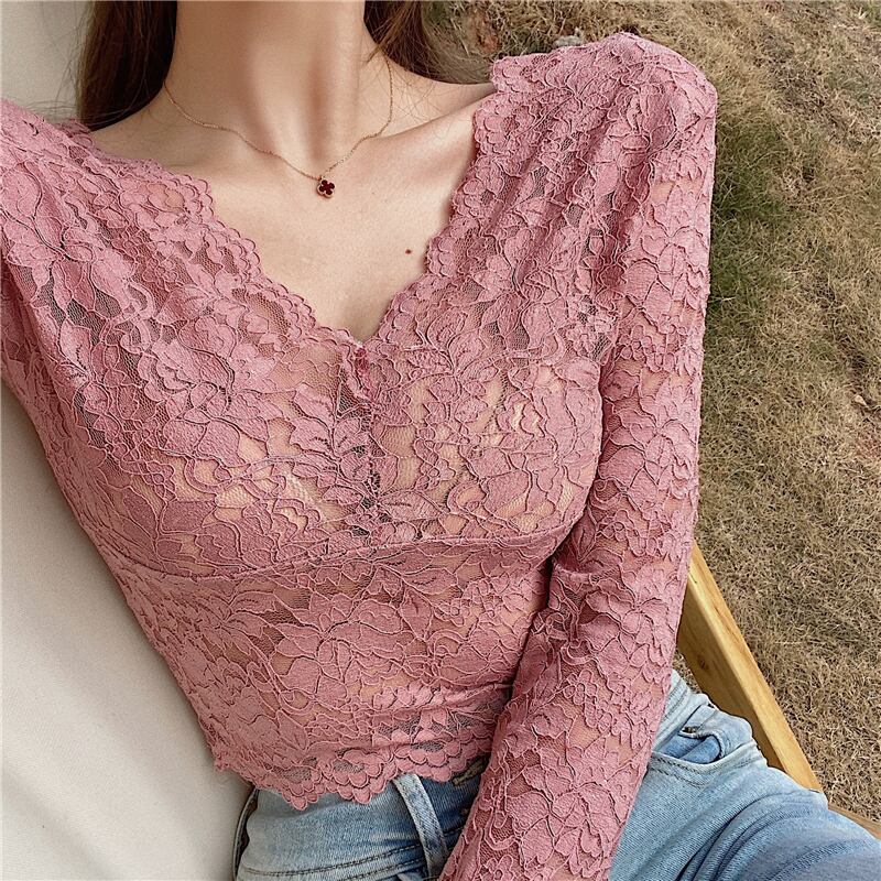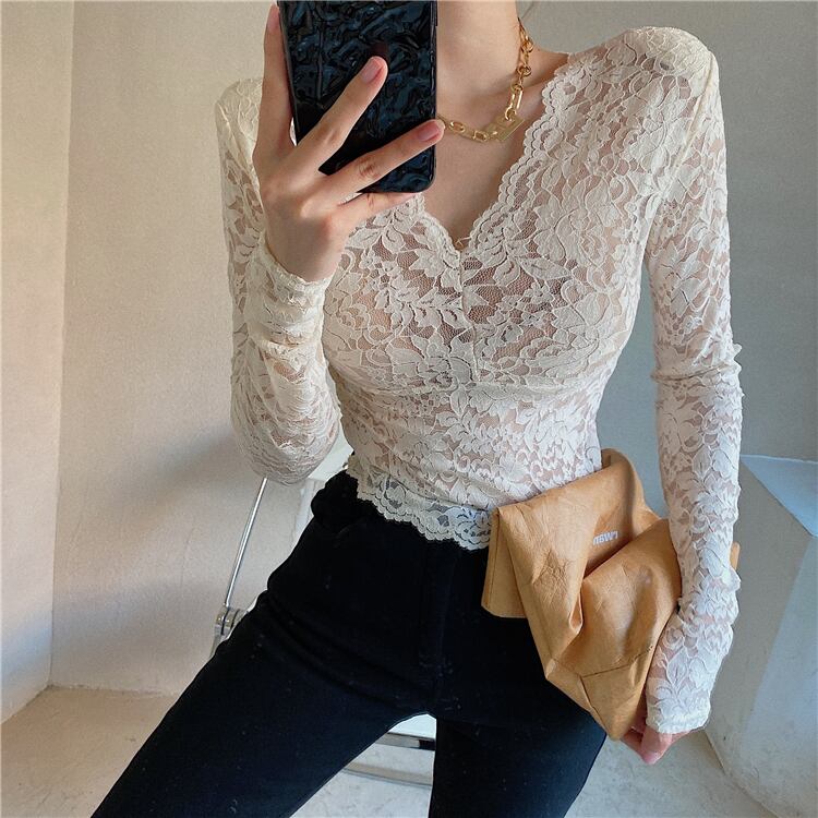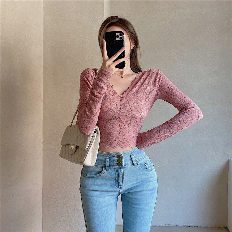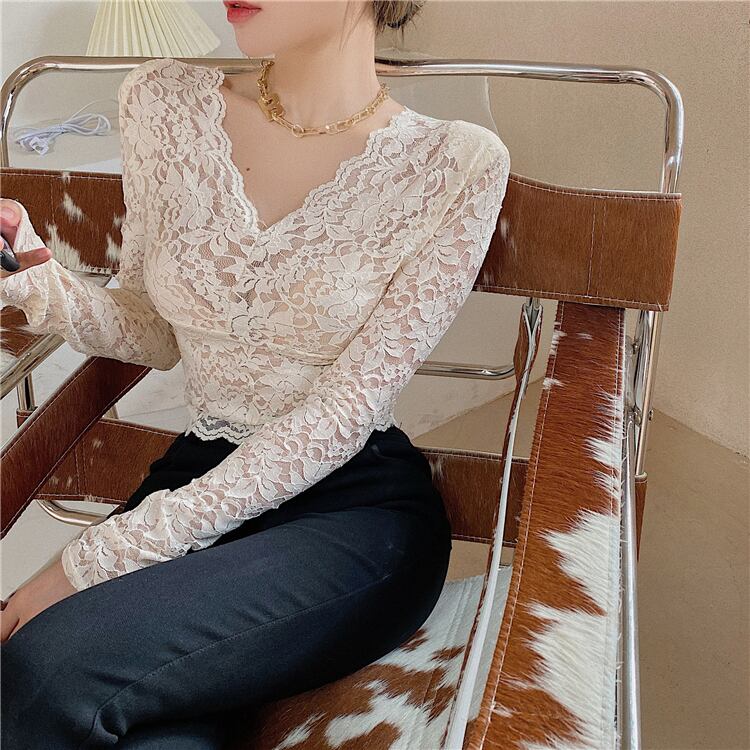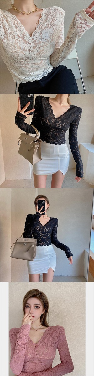 レースシャツ スリムフィットVネックオータムウィンターブラックショートトップス ロング 秋物 冬物 ブラックストロベリース75542278161