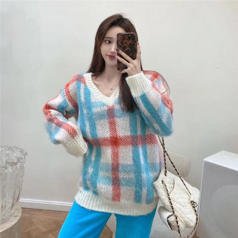 セーター レディースルーズ格子柄ニットオータムウィンターVネックトップス 秋物 冬物 ブラックストロベリース16197547297