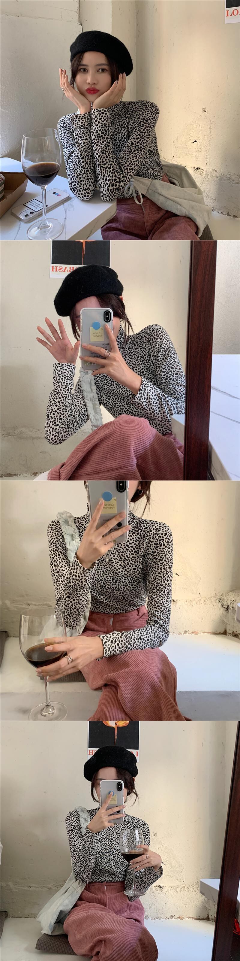 Tシャツ シャツ レオパードプリント柄スリムオータムウィンタースタイルカラートップス ロング 秋物 冬物 ブラックストロベリース20567753700