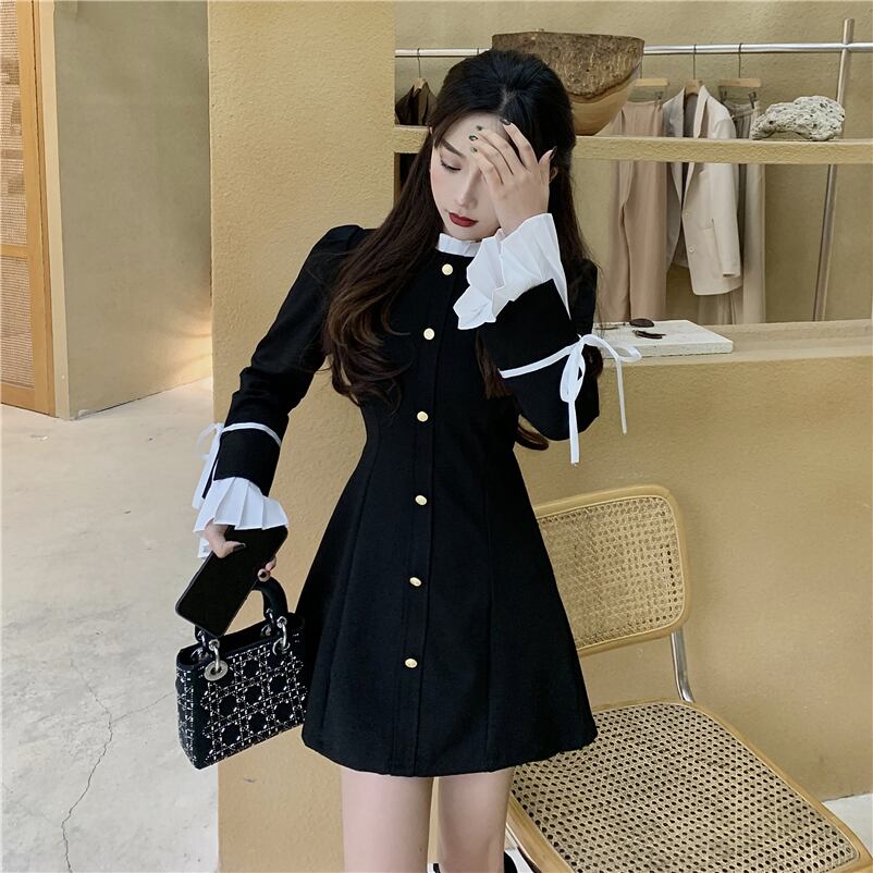ドレス スタンダードブラックショートスカート オータムウィンタースリムウェスト ロング レトロ 秋物 冬物 ブラックストロベリース73714617757