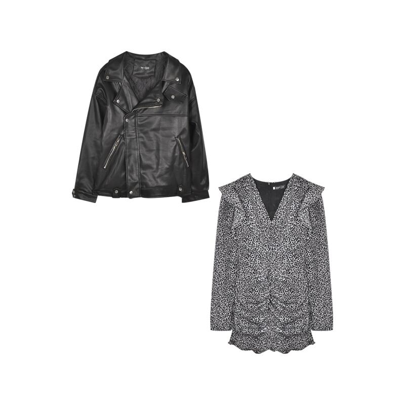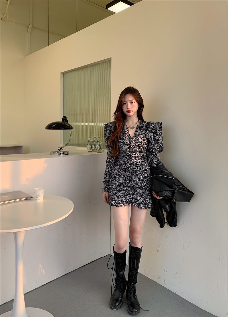 ドレス Vネックスリムレオパードプリント柄ショートスカート オータムウィンター ロング 秋物 冬物 ブラックストロベリース99116360504