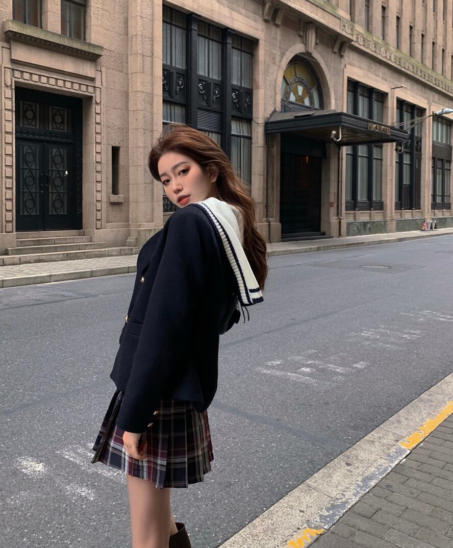 色:レッドチェックスカート,紺のスーツ,白いベスト