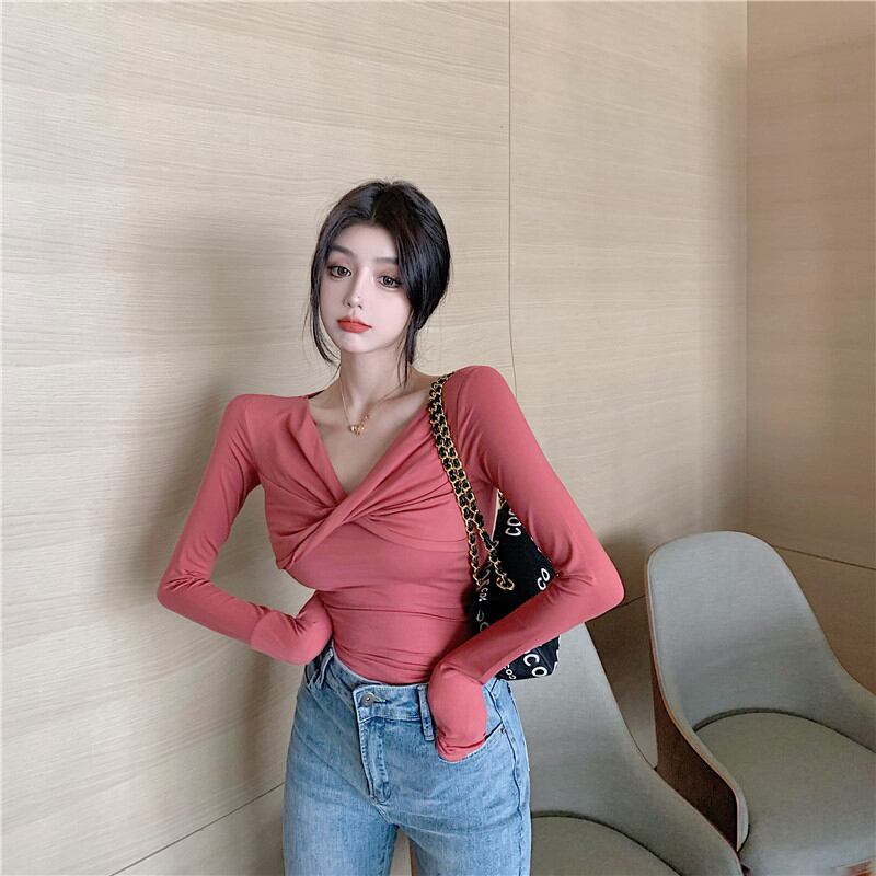 Tシャツ シャツ クロスVネックスリムオータムウィンタートップス ロング 秋物 冬物 ブラックストロベリース44667107956