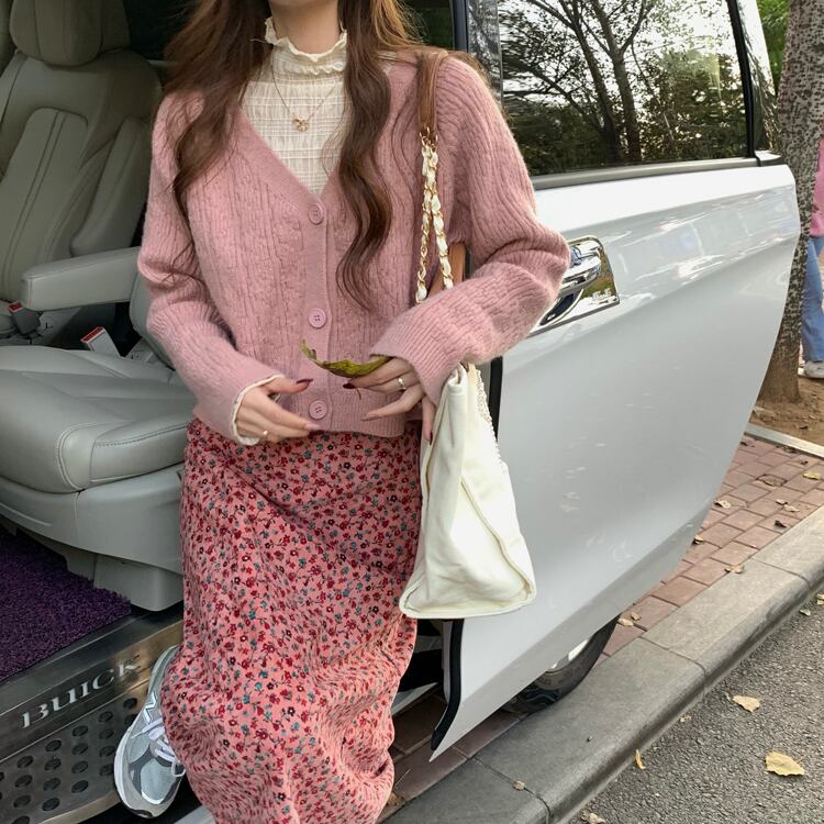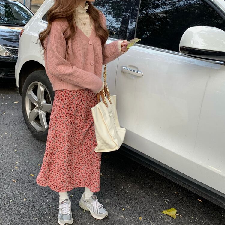 色:セーターカーディガン,アプリコットベース,フローラルスカート