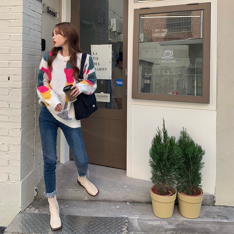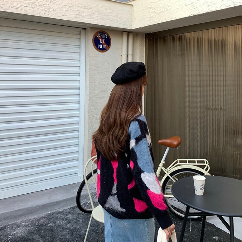 セーター カラールーズニットオータムウィンターラウンドネックトップス 秋物 冬物 Oネック ステッチ ブラックストロベリース14932607865