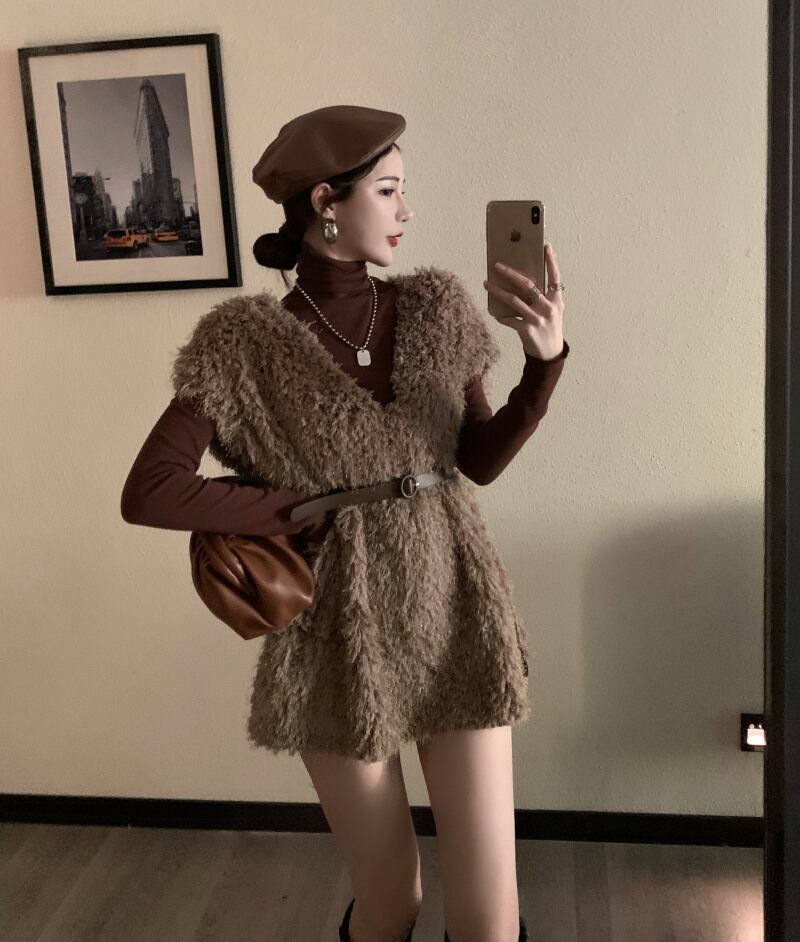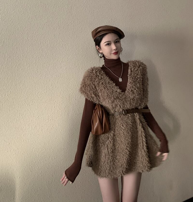 色:コーヒー色のボトミングシャツ,ラムカシミヤベスト,ベルト