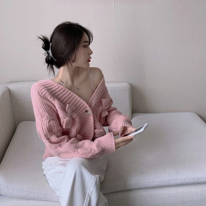 ニットセーター ショートルーズトップス オータムウィンターカーディガンジャケット ピンク リボン 秋物 冬物 ブラックストロベリース38438019610