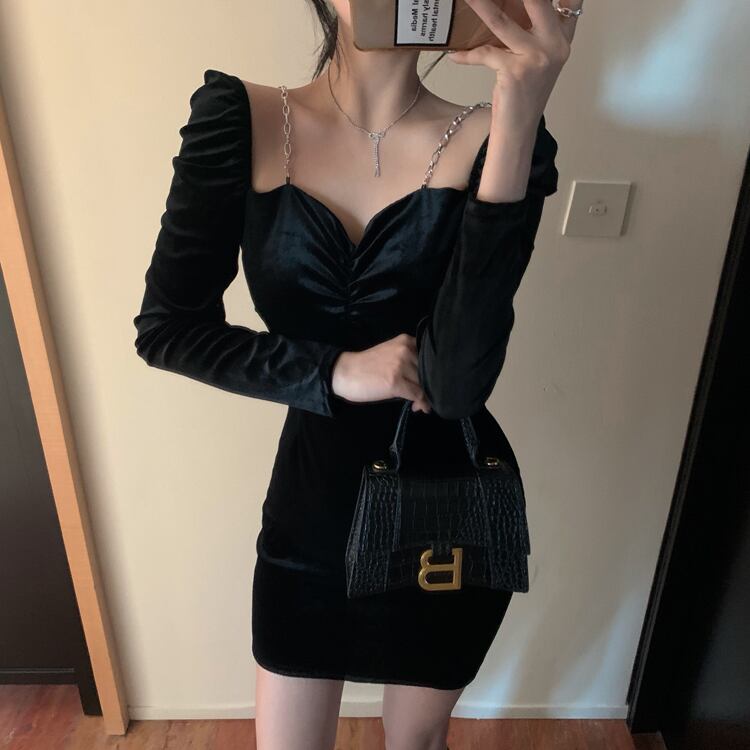 ベルベットドレス スカート オータムウィンターブラックスタンダード長袖スリーブ ロング レトロ 秋物 冬物 ブラックストロベリース66790678360