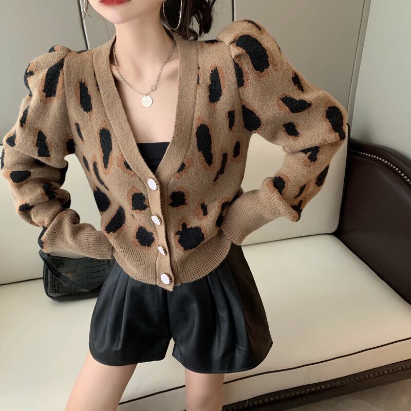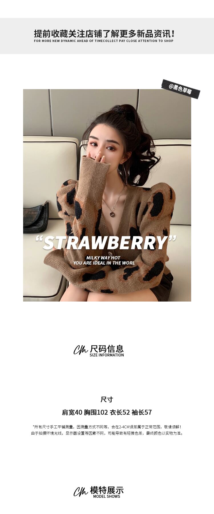 スタンダードレオパードニットセーター カーディガンジャケット レディースオータムウィンタールーズショート長袖スリーブトップス ロング レトロ 秋物 冬物 ブラックストロベリース81213756407