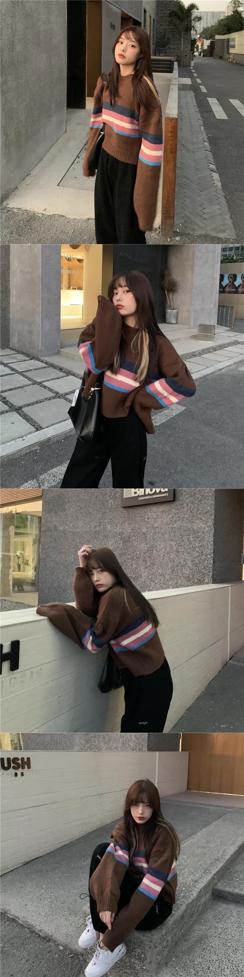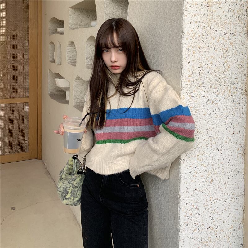 ストライプセーター オータムウィンタールーズスタイルショートトップス ロング 秋物 冬物 ブラックストロベリース60046114954