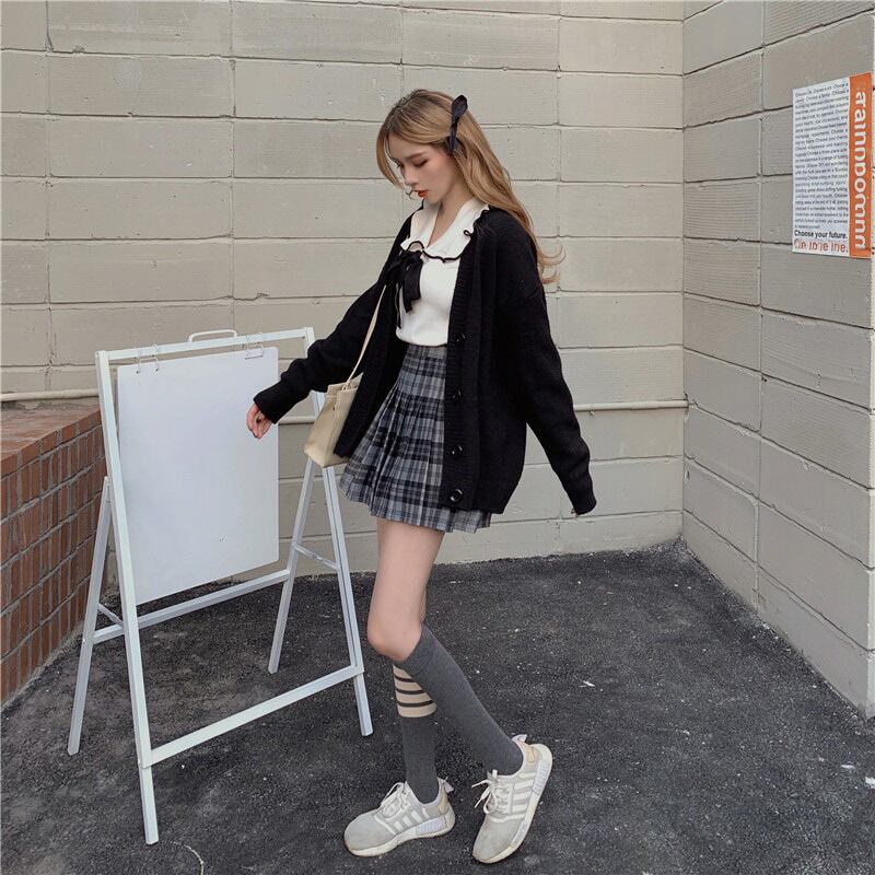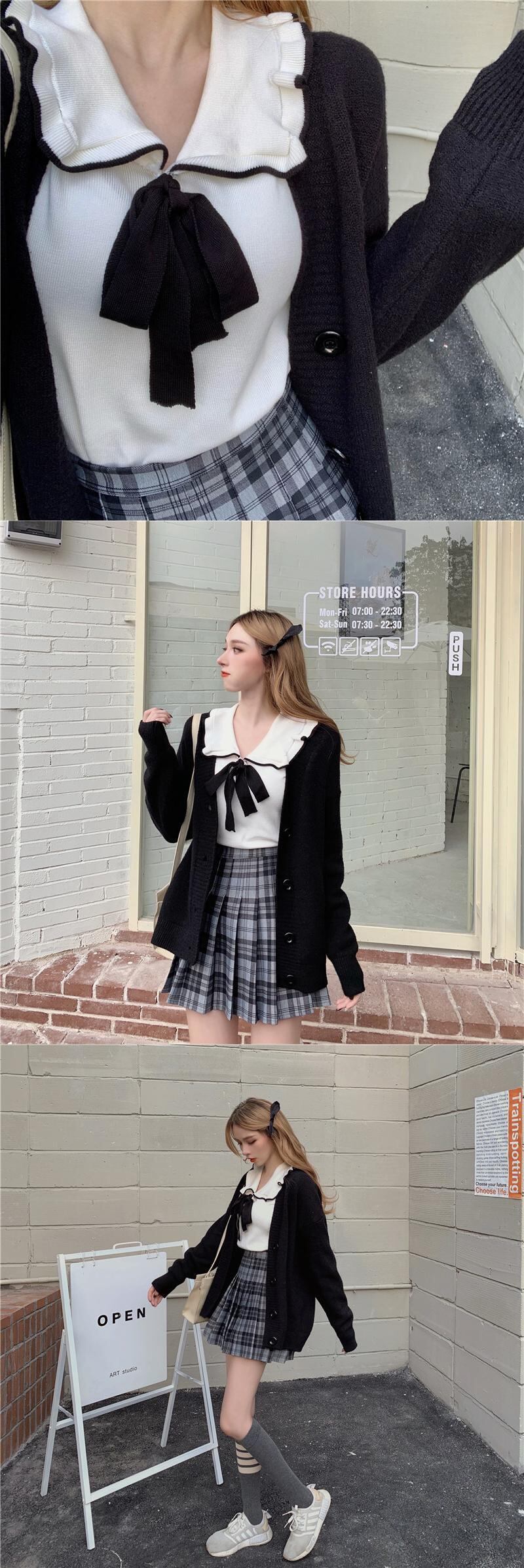 色:リボントップ,チェック柄スカート,ブラックカーディガン