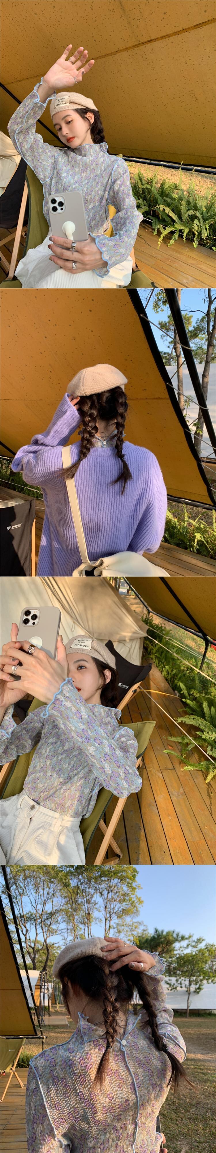 Tシャツ シャツ フローラルカラーオータムウィンタースリムトップス ロング ピンク 秋物 冬物 花柄 ブラックストロベリース1753851396