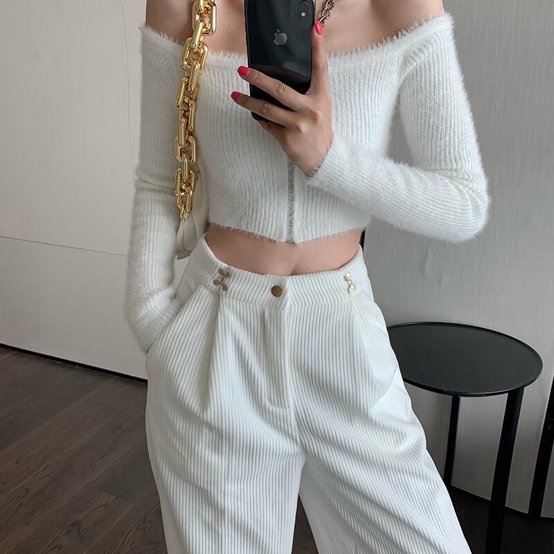 ホワイトコーデュロイカジュアルパンツ オータムウィンターハイウェストウェストワイドレッグルーズ薄手 秋物 冬物 ワイドパンツ ブラックストロベリース54786064461