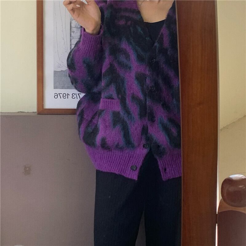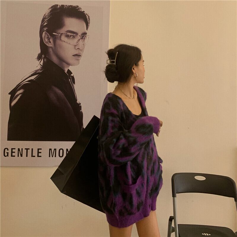 レオパードプリント柄ウールニットセーター カーディガンジャケット レディースオータムウィンタールーズスタイルトップス 秋物 冬物 ブラックストロベリース6671830397