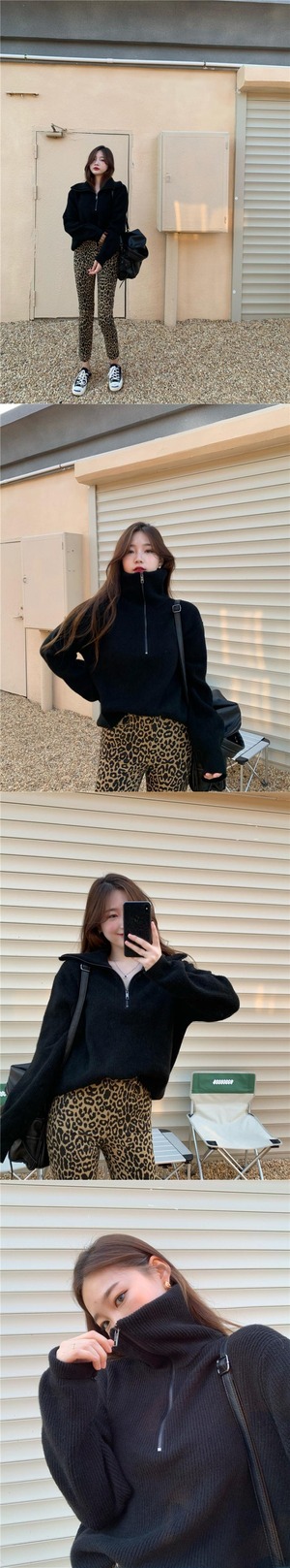 色:茶色のセーター,黒いセーター,ヒョウ柄パンツ
