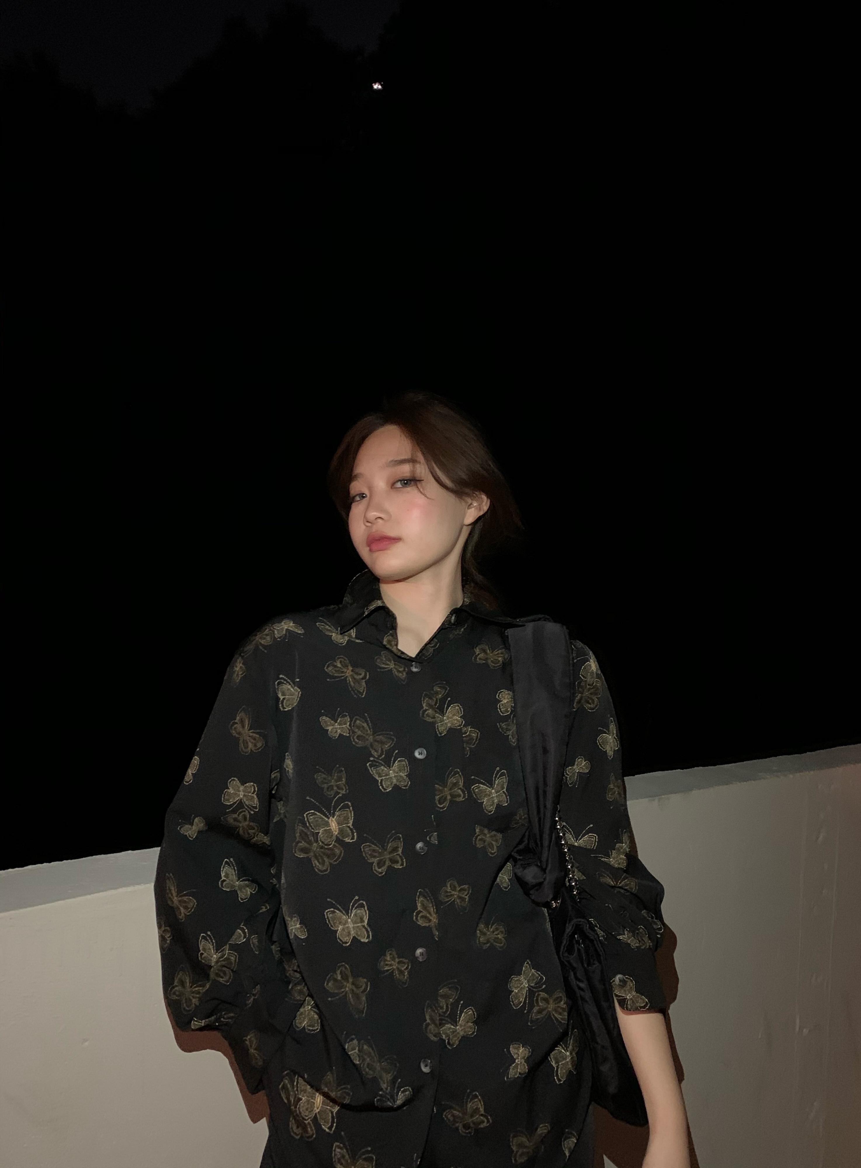 Butterflyデザイン シャツ オータムウィンタースタイルルーズトップス ロング 秋物 冬物 ブラックストロベリース2451258346