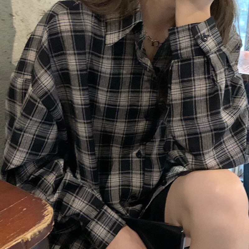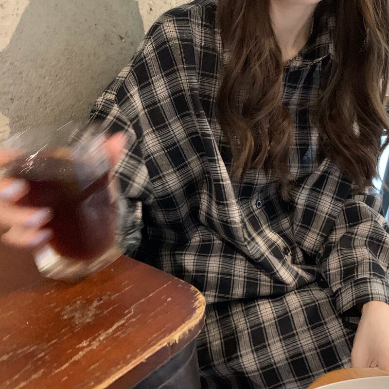 ルーズブラウス スタンダード格子柄シャツ ジャケット スプリングスタイルトップス ロング レトロ 春物 ブラックストロベリース78700729350
