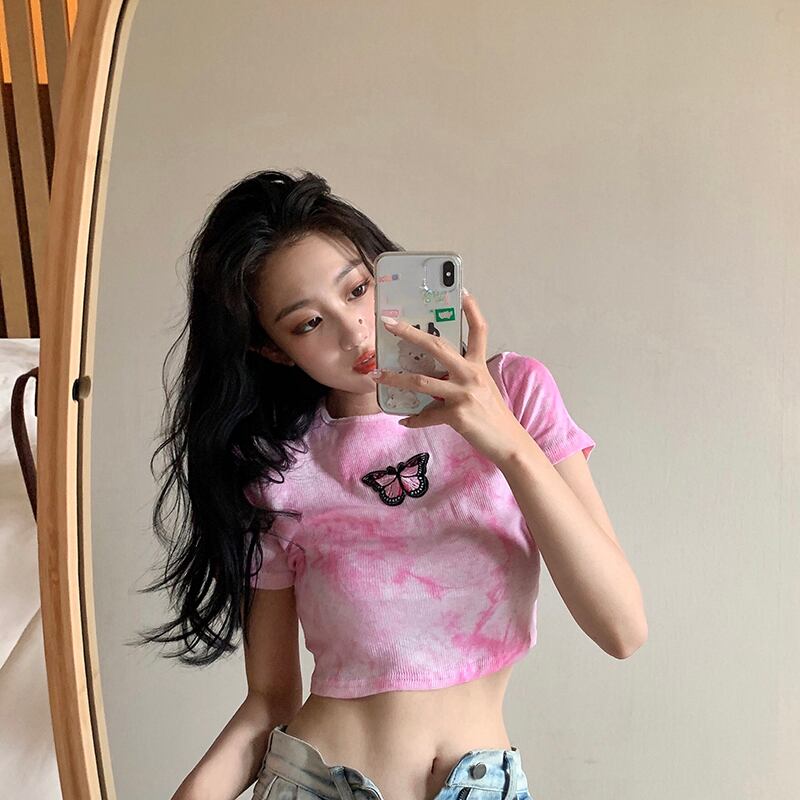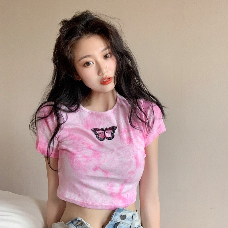 Tシャツ シャツ ショートスリムスプリングButterflyデザイン トップス ピンク 春物 ブラックストロベリース40421573082