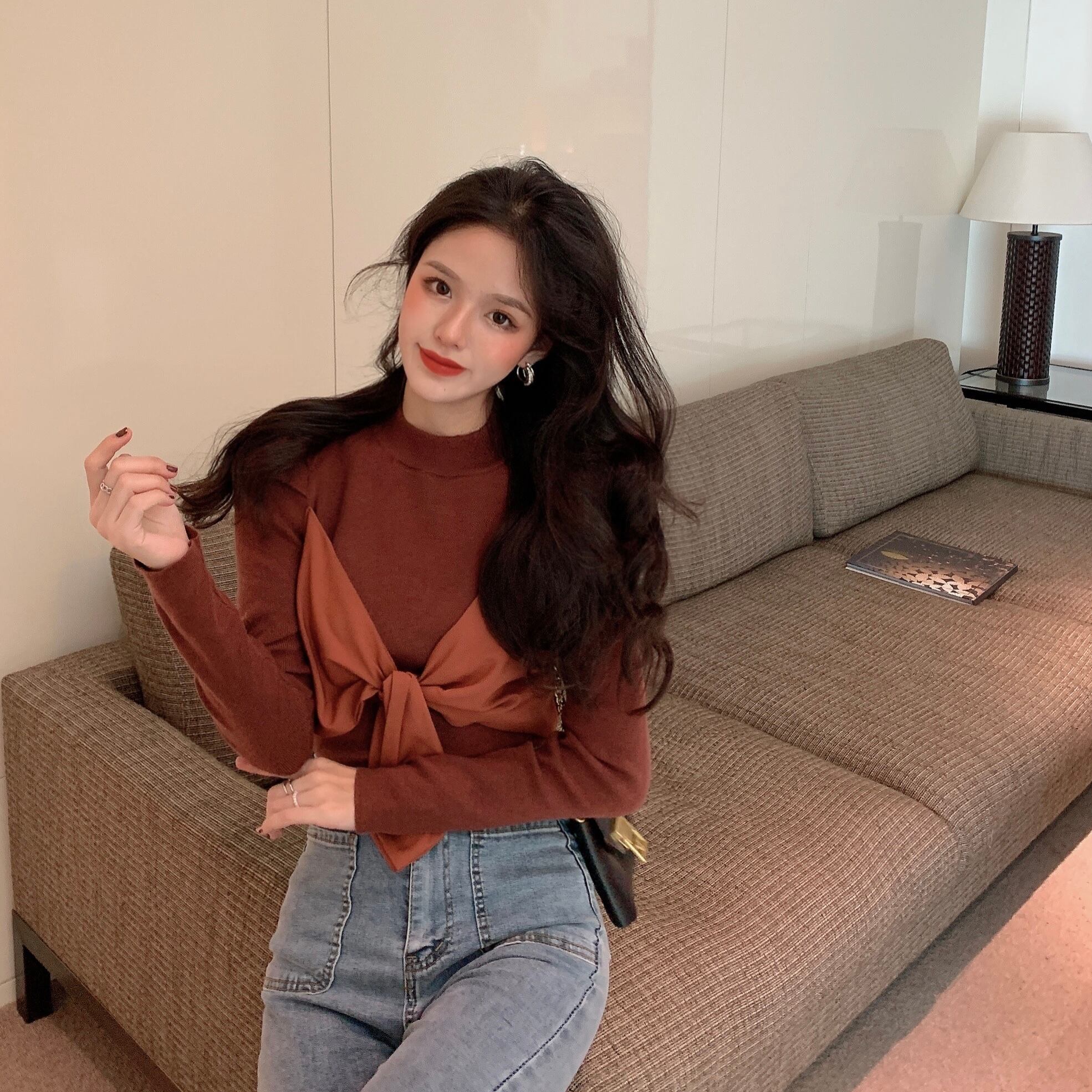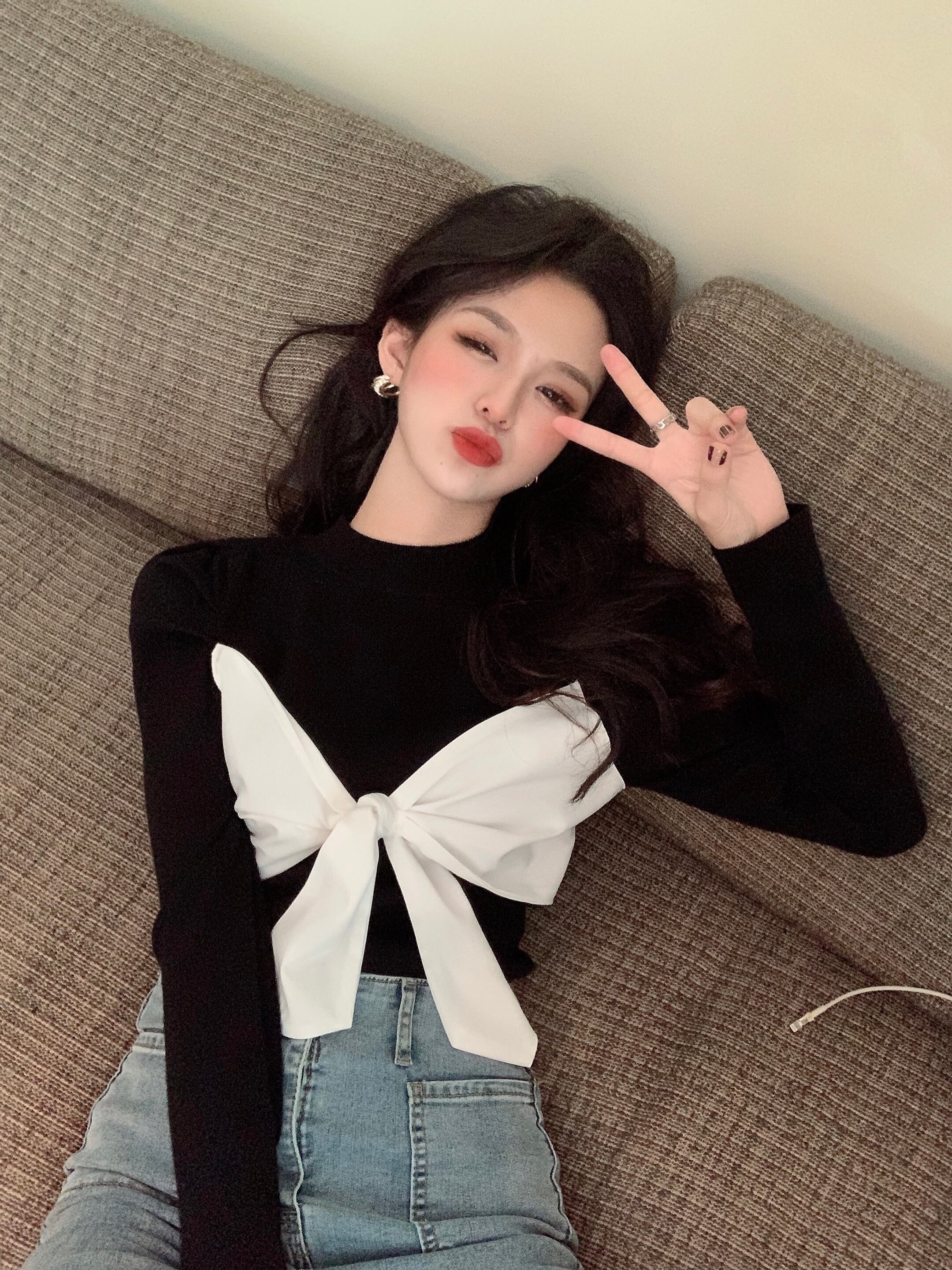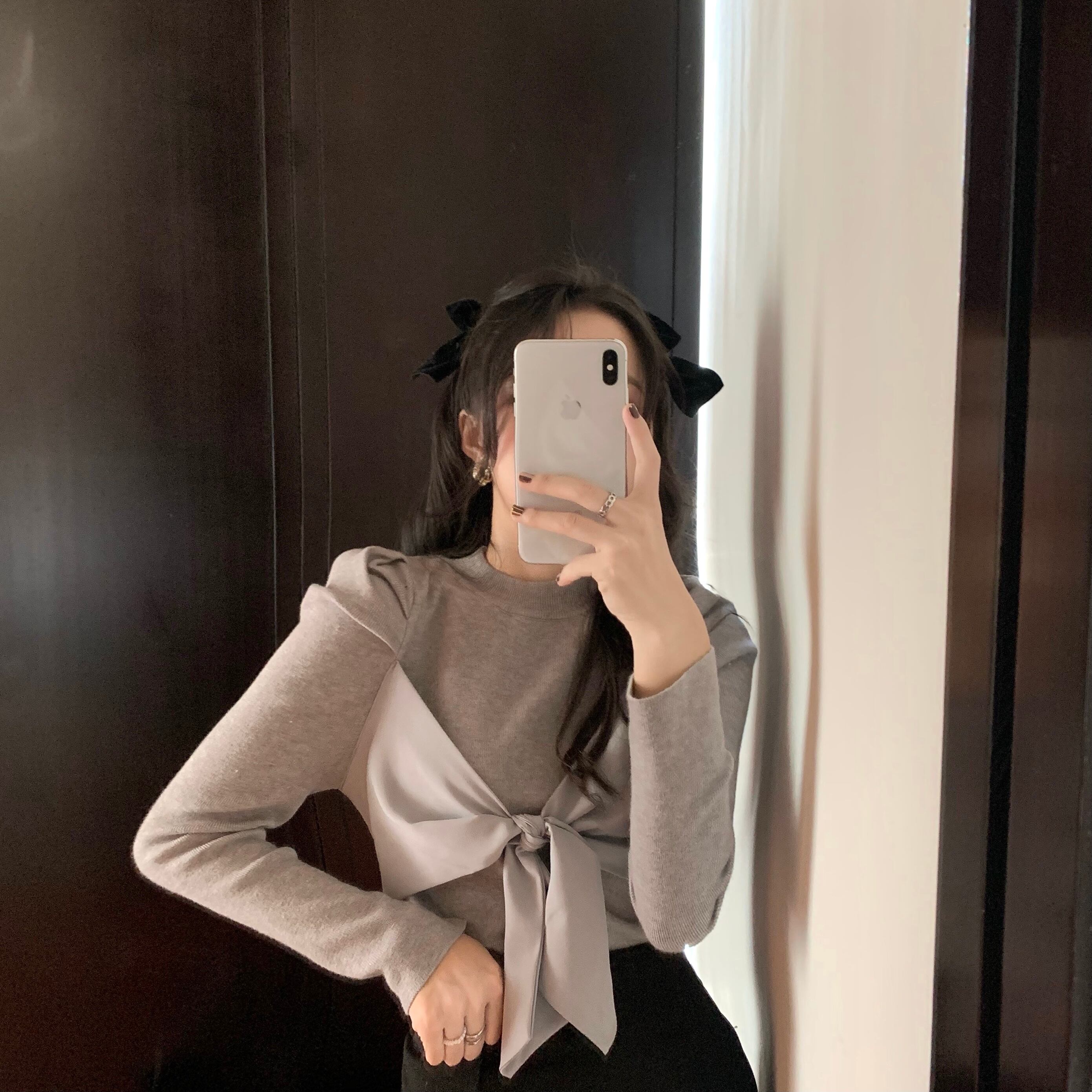 ニットセーター スリムシャツ スプリングトップス ロング リボン 春物 ブラックストロベリース59914757798