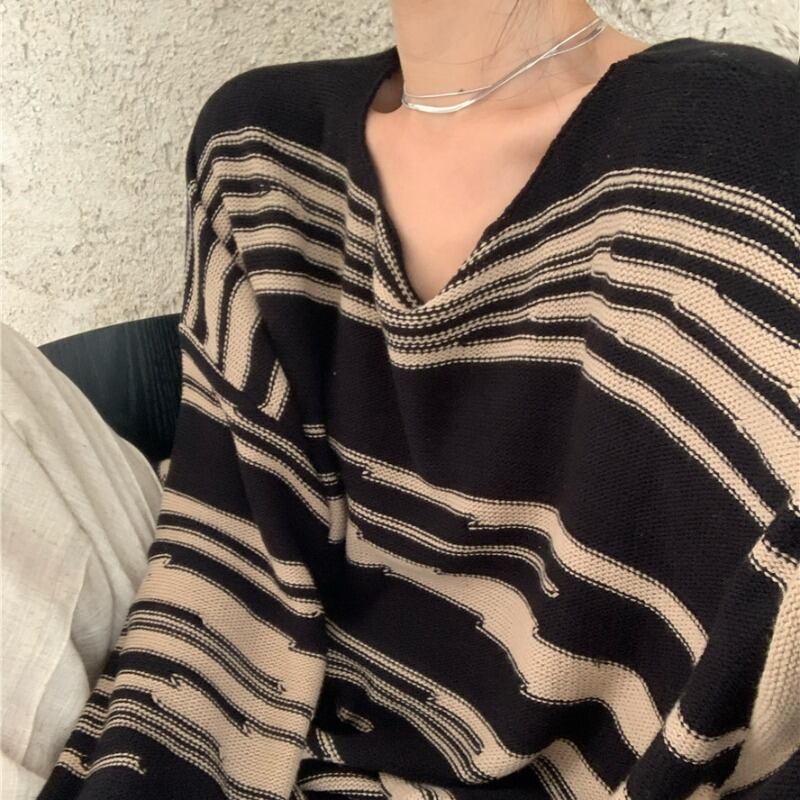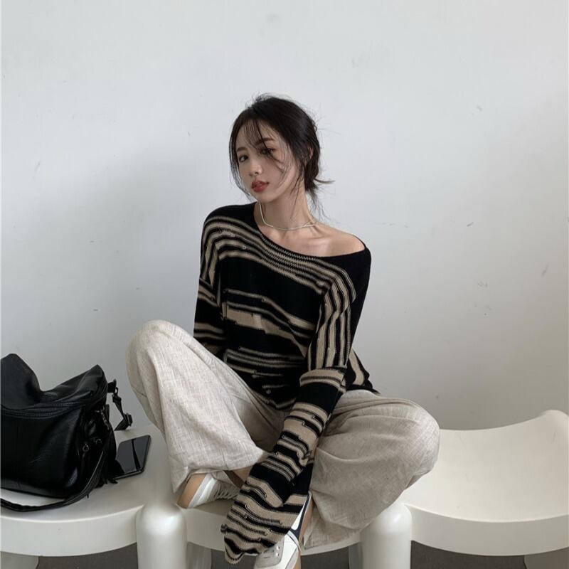 ニットセーター レディースルーズストライプスプリングスタイルシャツ トップス 春物 ブラックストロベリース78484884165