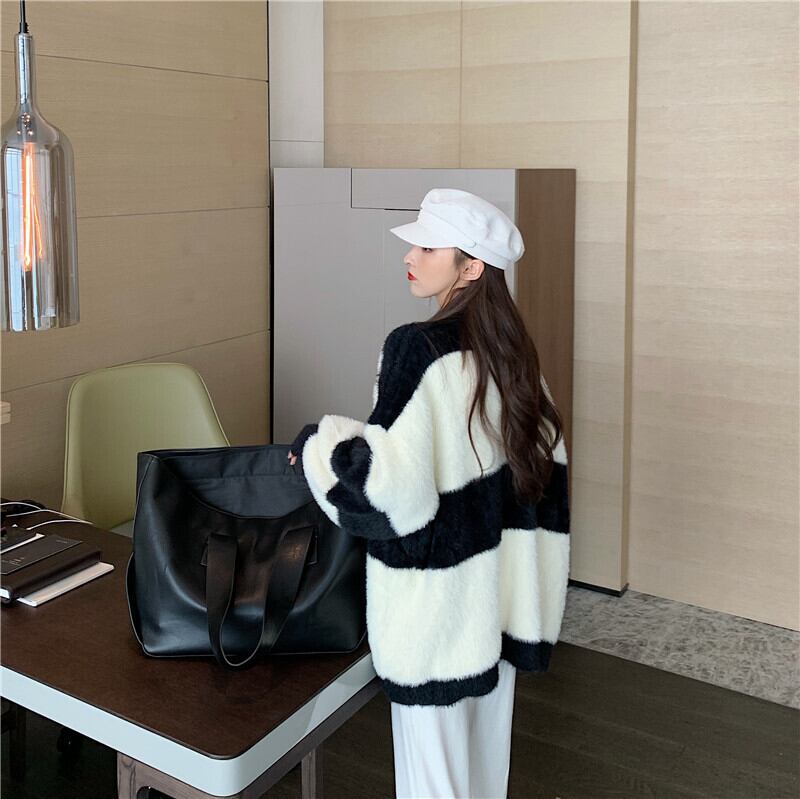 セーター ブラックホワイトストライプルーズスタンダードニットジャケット スプリングオータムカーディガン レトロ 春物 秋物 ブラックストロベリース41763972470
