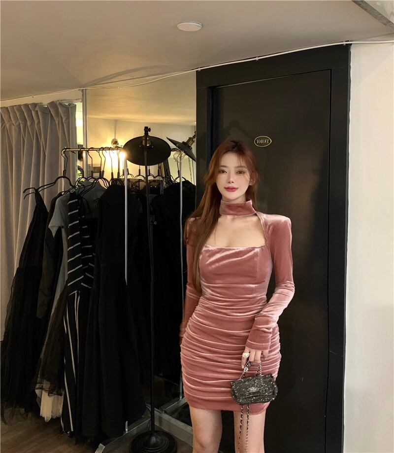 ベルベットドレス ウェストショートスカート スプリング ロング ピンク 春物 ブラックストロベリース1473843307