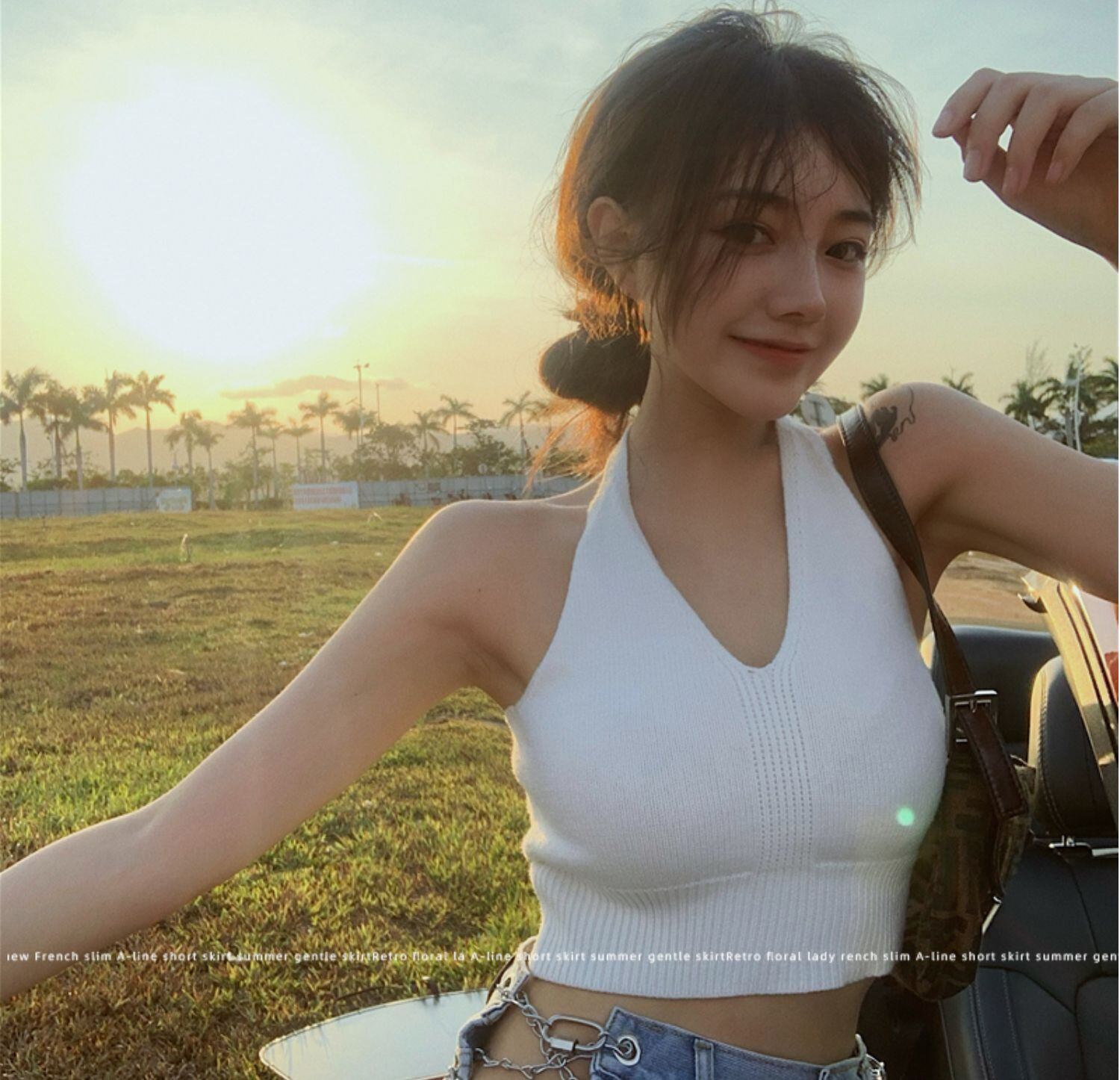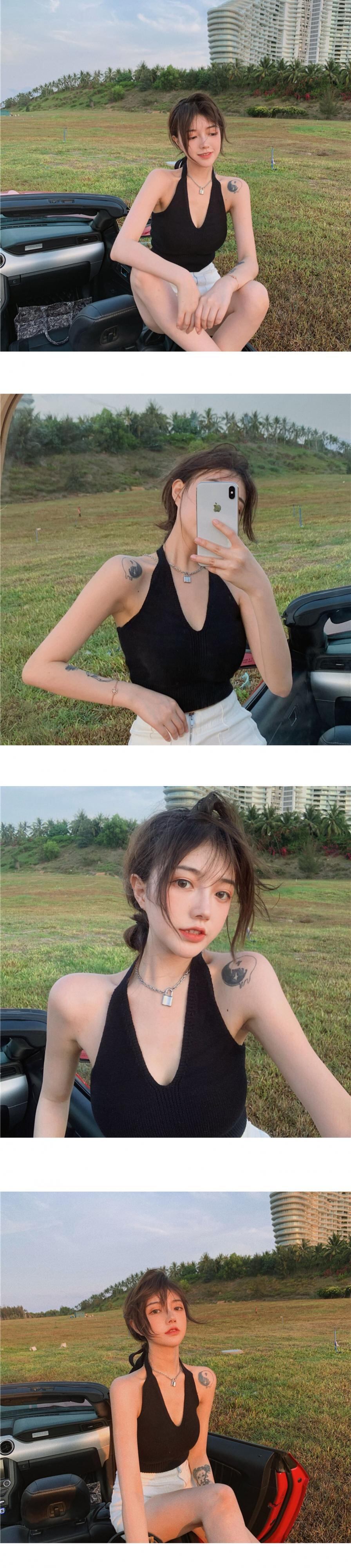 ショートノースリーブニットサマーホルタートップス Vネックシャツ 半袖 ハーフスリーブ 夏物 ブラックストロベリース33849414026
