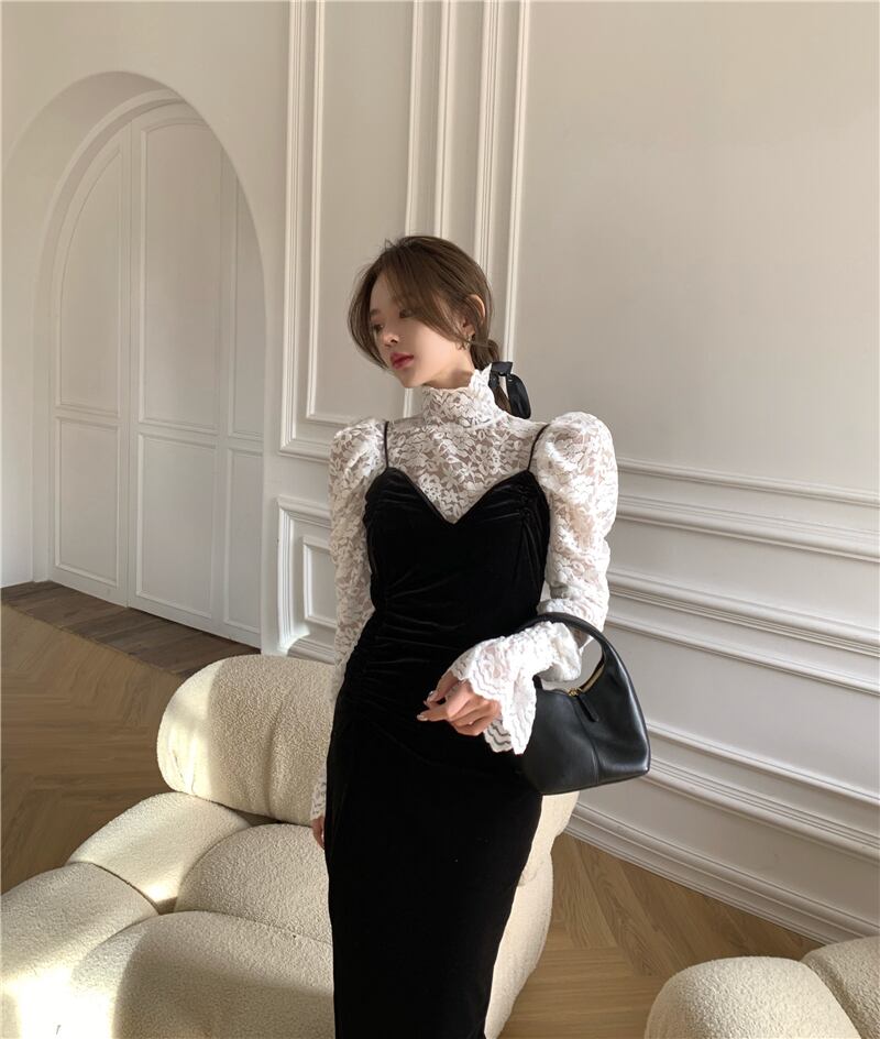 ベルベットドレス ブラックウェストスカート スプリングスタイル薄手 春物 ブラックストロベリース98586468240