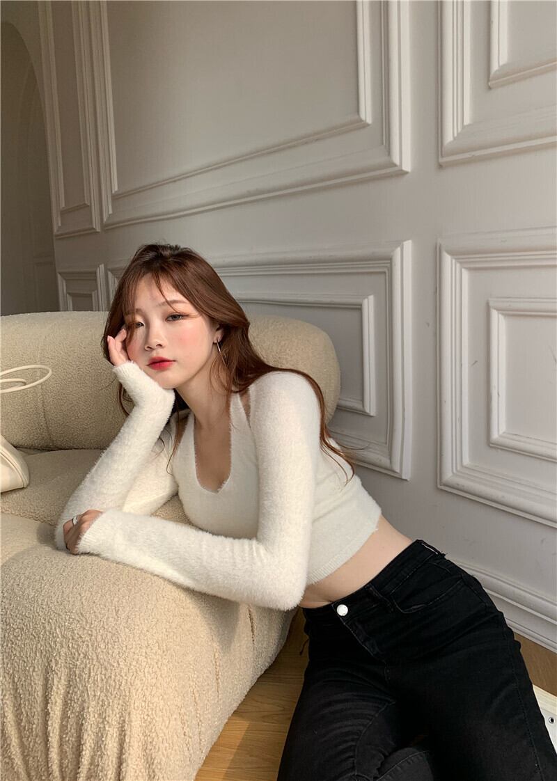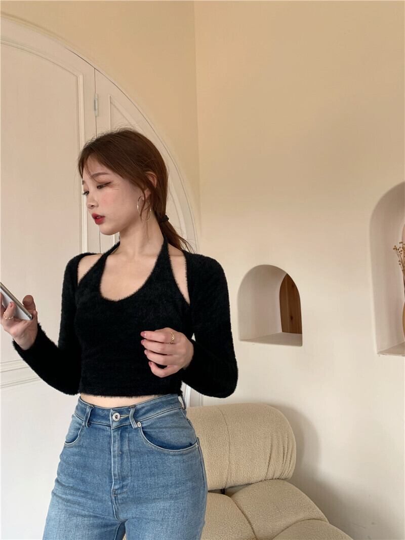 ニットセーター ショートVネックホワイトジャケット スプリングオータム 春物 秋物 ブラックストロベリース76851621084
