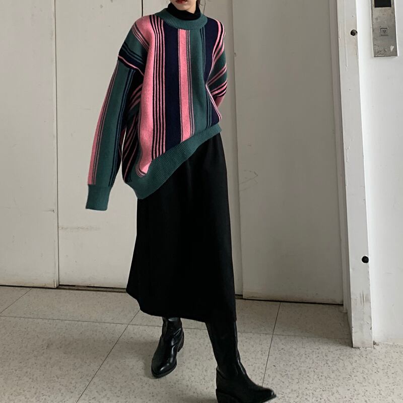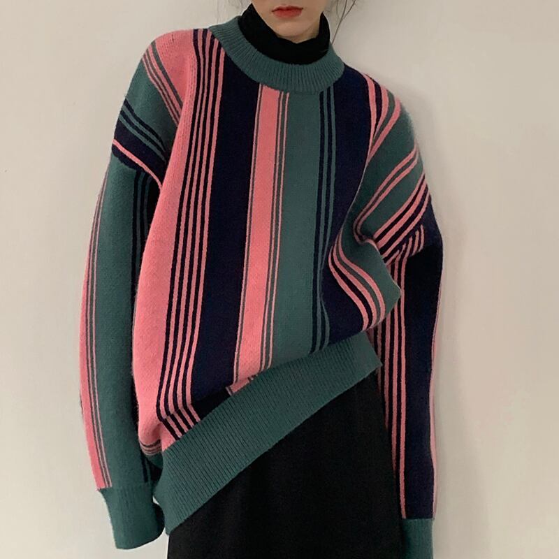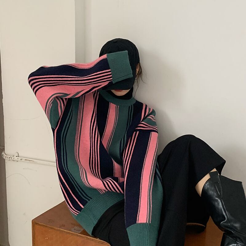 セーター ルーズストライプニットスプリングスタンダードジャケット トップス レトロ 春物 ブラックストロベリース43863182592
