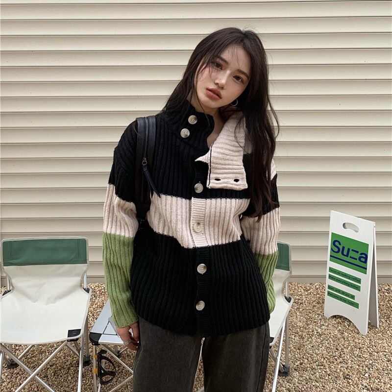 セーター カーディガンジャケット ルーズニット スプリング長袖スリーブトップス ロング 春物 ステッチ ブラックストロベリース24650512016