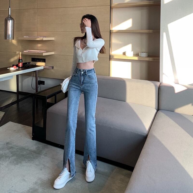 ジーンズ スリットスリムハイウェストレディーススプリングスタンダードパンツ レッド レトロ 春物 ブラックストロベリース55643350395