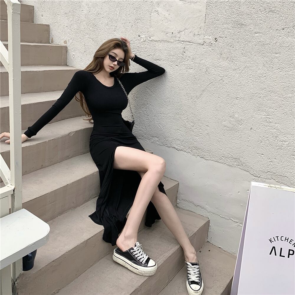ドレス スタンダード長袖スリーブスプリングオータム薄手スカート ロング レトロ 春物 秋物 ブラックストロベリース51428717576
