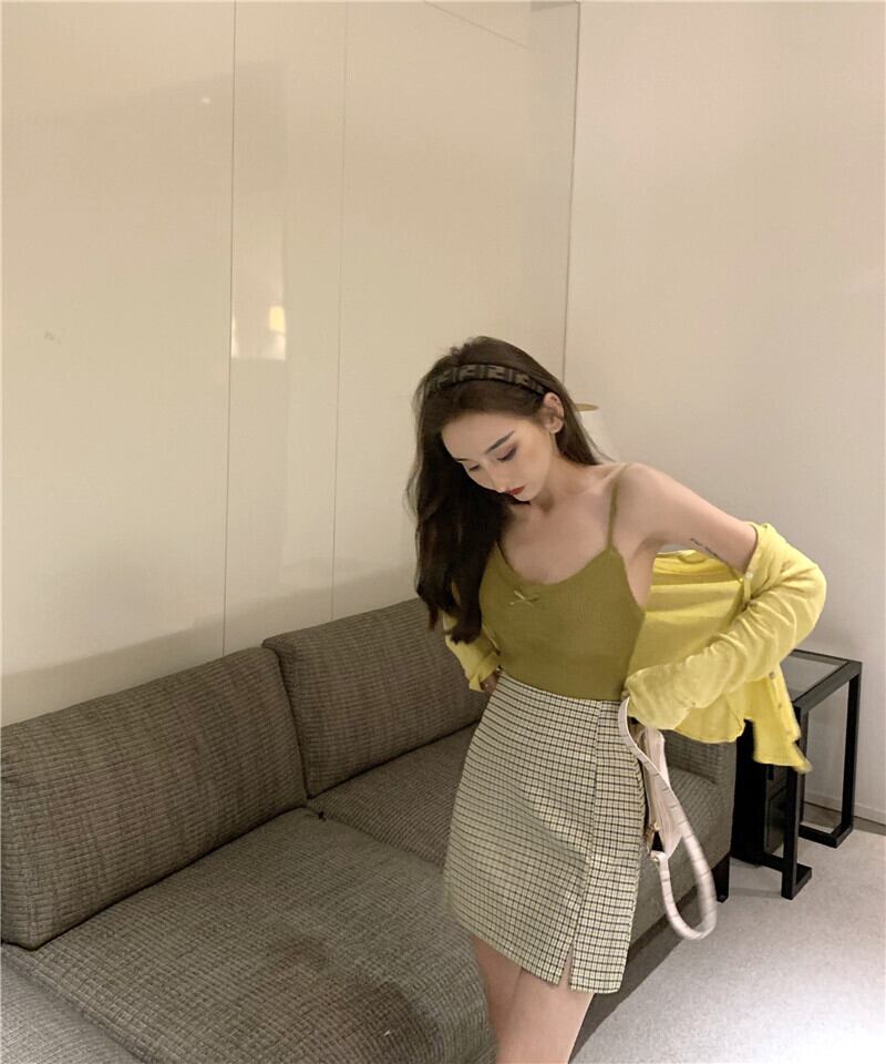 色:黄色のサスペンダー,チェック柄スカート,黄色のカーディガン