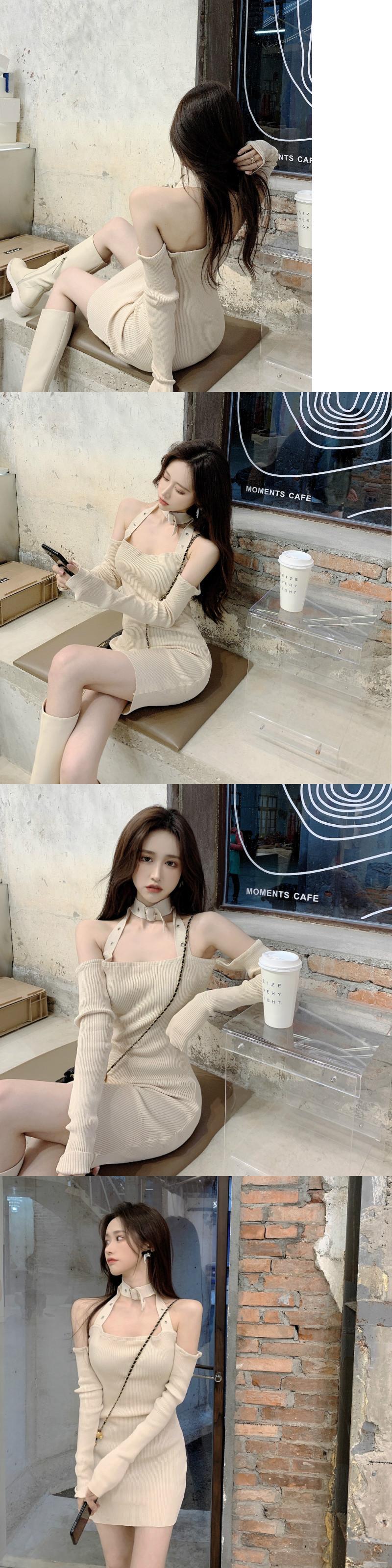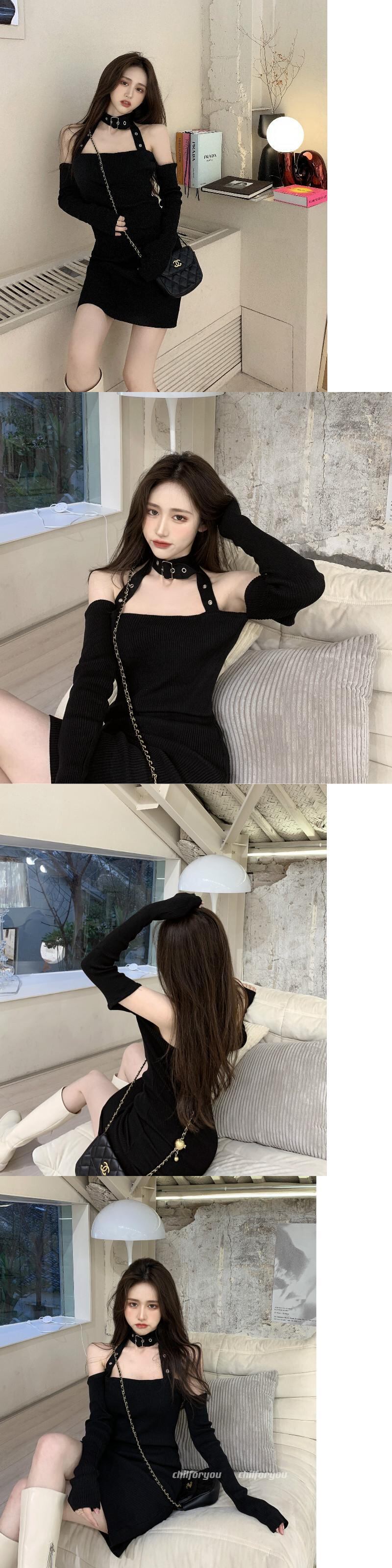 ホルタードレス ショートスカート スプリングサマー薄手ウェスト ロング 春物 夏物 オフショルダー ブラックストロベリース92931909786
