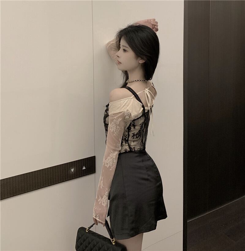 シフォンレースシャツ スリムストラップレススプリングトップス ロング 春物 ブラックストロベリース83283800257