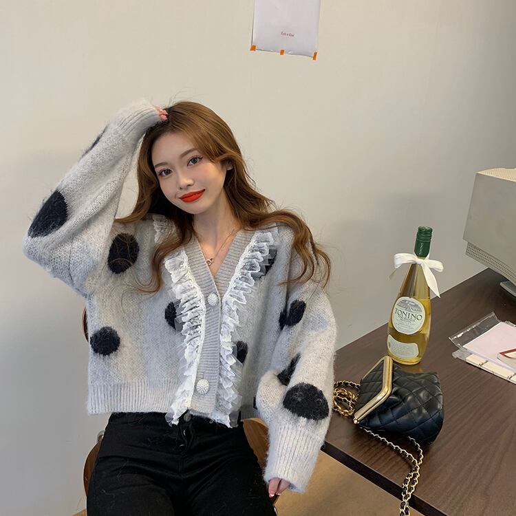 セーター レースラッフルルーズショートニットトップス スプリングカーディガンジャケット 春物 ブラックストロベリース99154573659