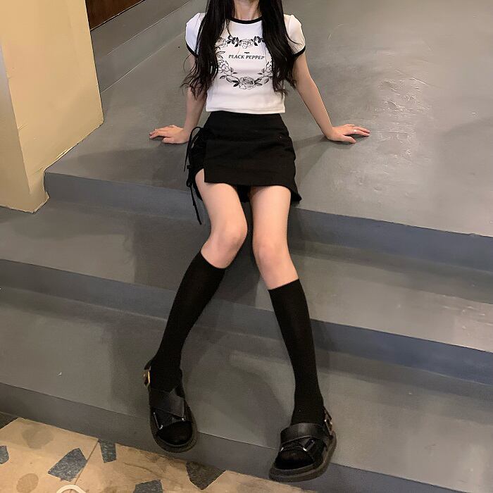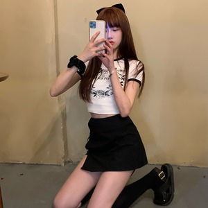 プリントショートTシャツ サマーハイウェストホワイトトップス コットン 夏物 ヨーロピアン ブラックストロベリース11666473594