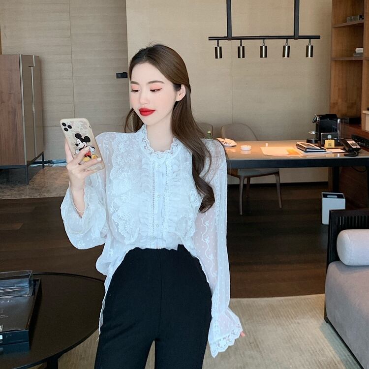 レースシャツ レディースルーズスタイルホワイトスプリングオータムトップス ロング 春物 秋物 ブラックストロベリース39628284266