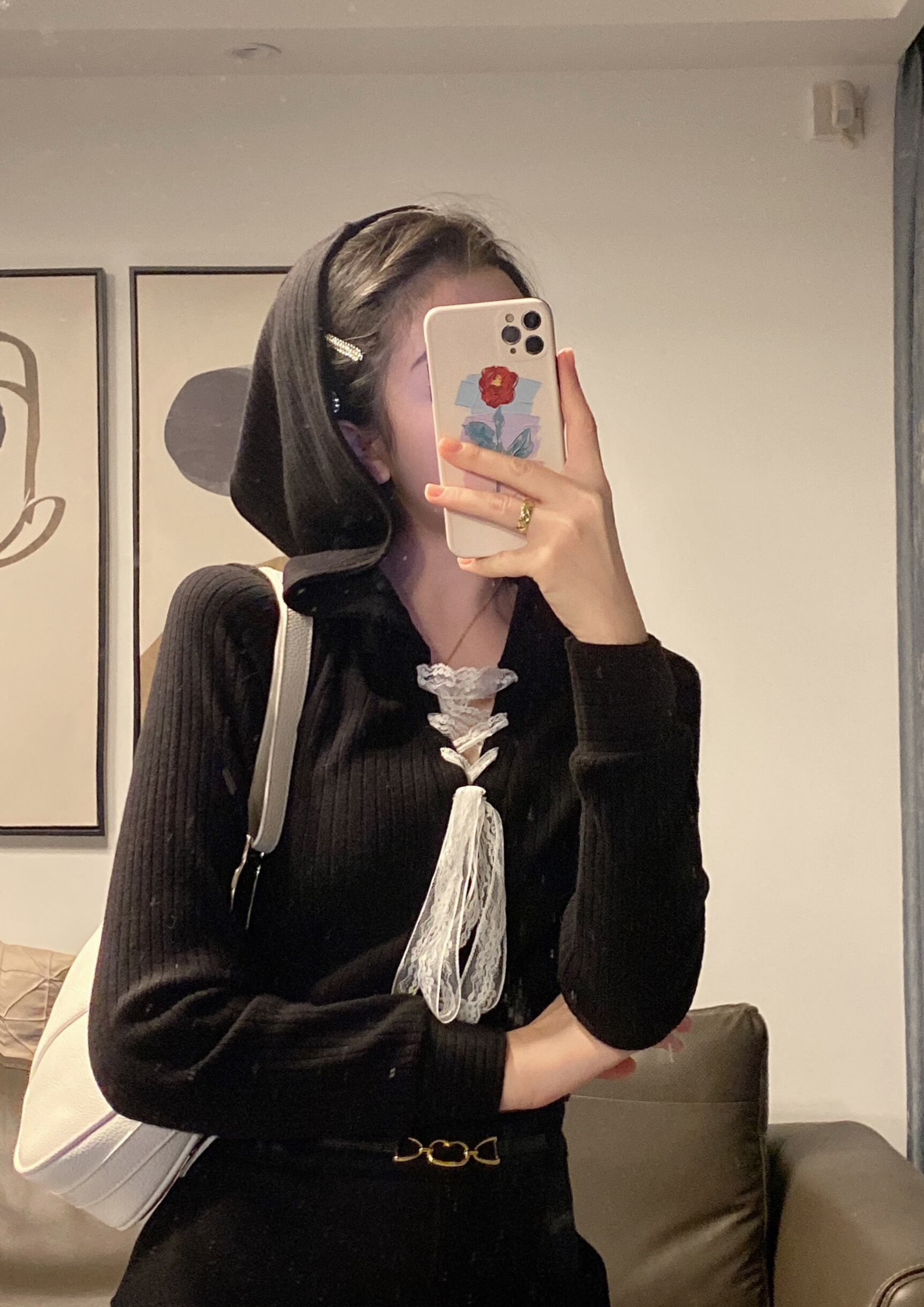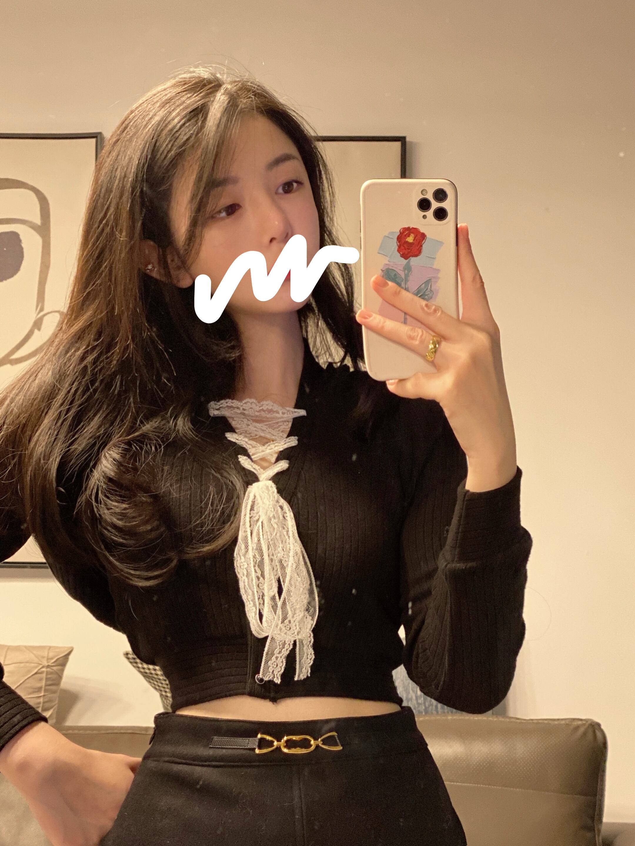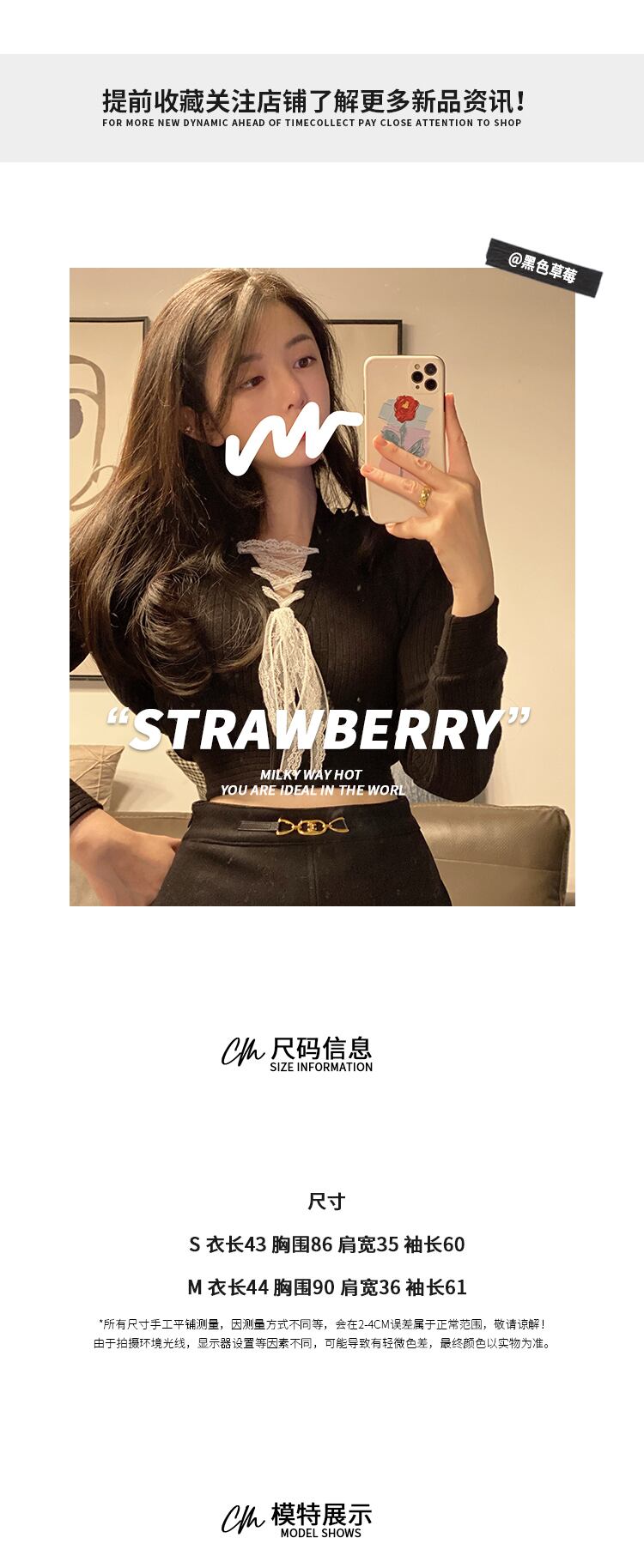 ニット レースブラックシャツ スプリングカーディガンセーター トップス リボン 春物 ブラックストロベリース30503336892