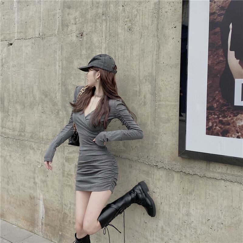 ドレス グレーウェストスリムVネックスカート ショートスプリングオータム ロング 春物 秋物 ブラックストロベリース61011978399