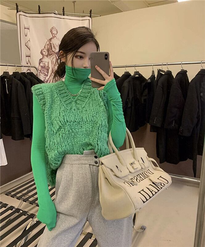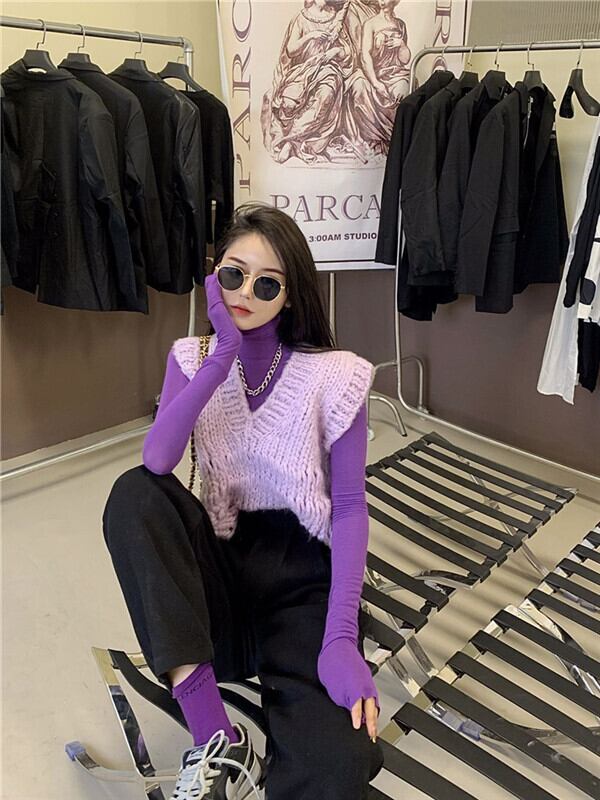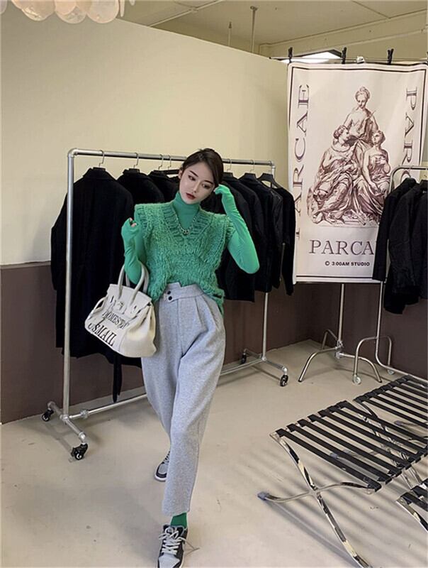 色:パープルボトミングシャツ,グリーンボトミングシャツ,緑のセーターベスト,パープルセーターベスト,グレーパンツ,黒いズボン